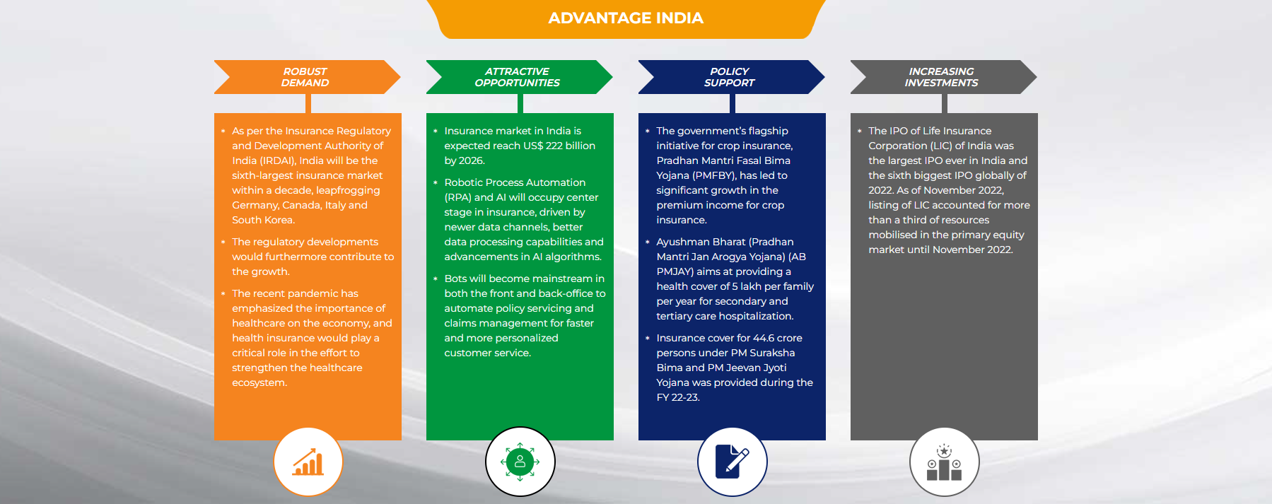- Insurance market in India is expected reach US$ 222 billion by 2026.