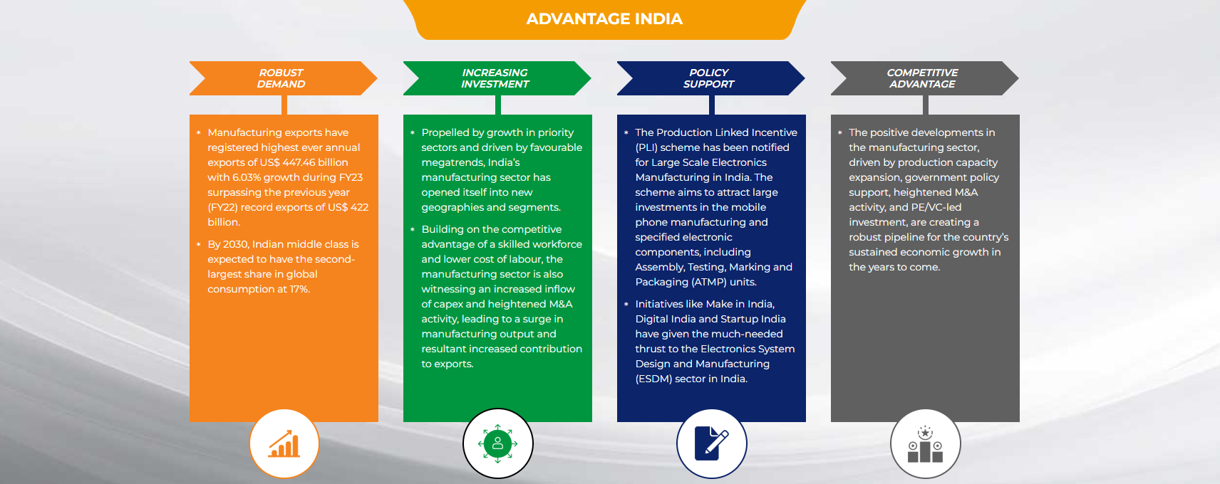 Manufacturing exports have registered highest ever annual exports of US$ 447.46 billion with 6.03% growth during FY23 surpassing the previous year (FY22) record exports of US$ 422 billion. By 2030, Indian middle class is expected to have the second-largest share in global consumption at 17%.