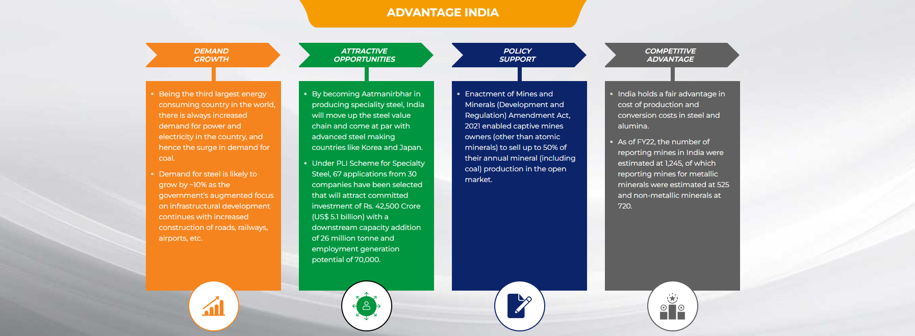 India holds a fair advantage in production and conversion costs in steel and alumina. Its strategic location enables export opportunities to develop as well as fast-developing Asian markets. As of FY22, the number of reporting mines in India were estimated at 1,425, of which reporting mines for metallic minerals were estimated at 525 and non-metallic minerals at 720.