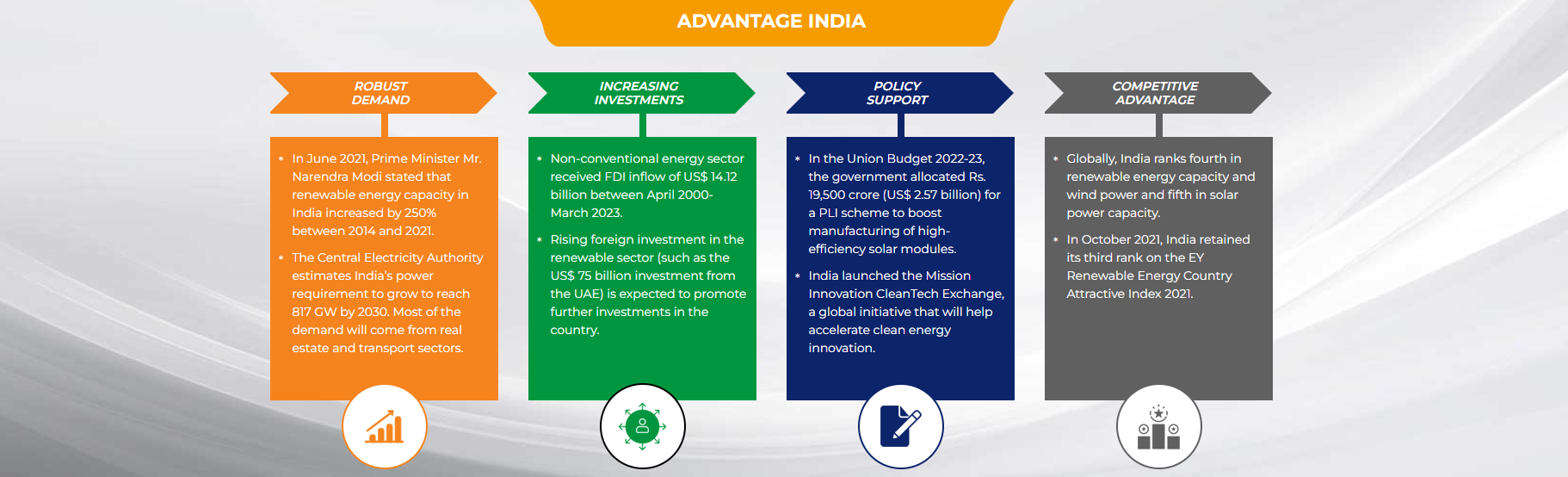 India’s ambitious renewable energy goals are transforming its power sector. The rising population and widespread electrification in rural homes are fueling the demand for energy to power homes, businesses and communities. Clean energy will reduce pollution levels as villages become self-sustainable with their use of clean energy. In 2022, India's renewable energy sector is expected to boom with a likely investment of US$ 15 billion this year, as the government focuses on electric vehicles, green hydrogen, and the manufacturing of solar equipment.