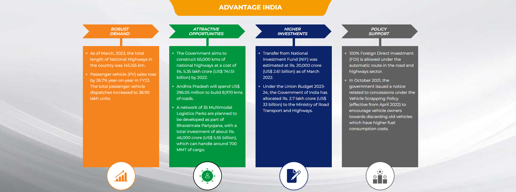 The Government, through a series of initiatives, is working on policies to attract significant investor interest. A total of 600+ sites are planned to be awarded by 2024-25 of which 144 Wayside Amenities (WSAs) have already been awarded. In the next five years, National Highway Authority of India (NHAI) will be able to generate Rs. 1 lakh crore (US$ 14.30 billion) annually from toll and other sources.
