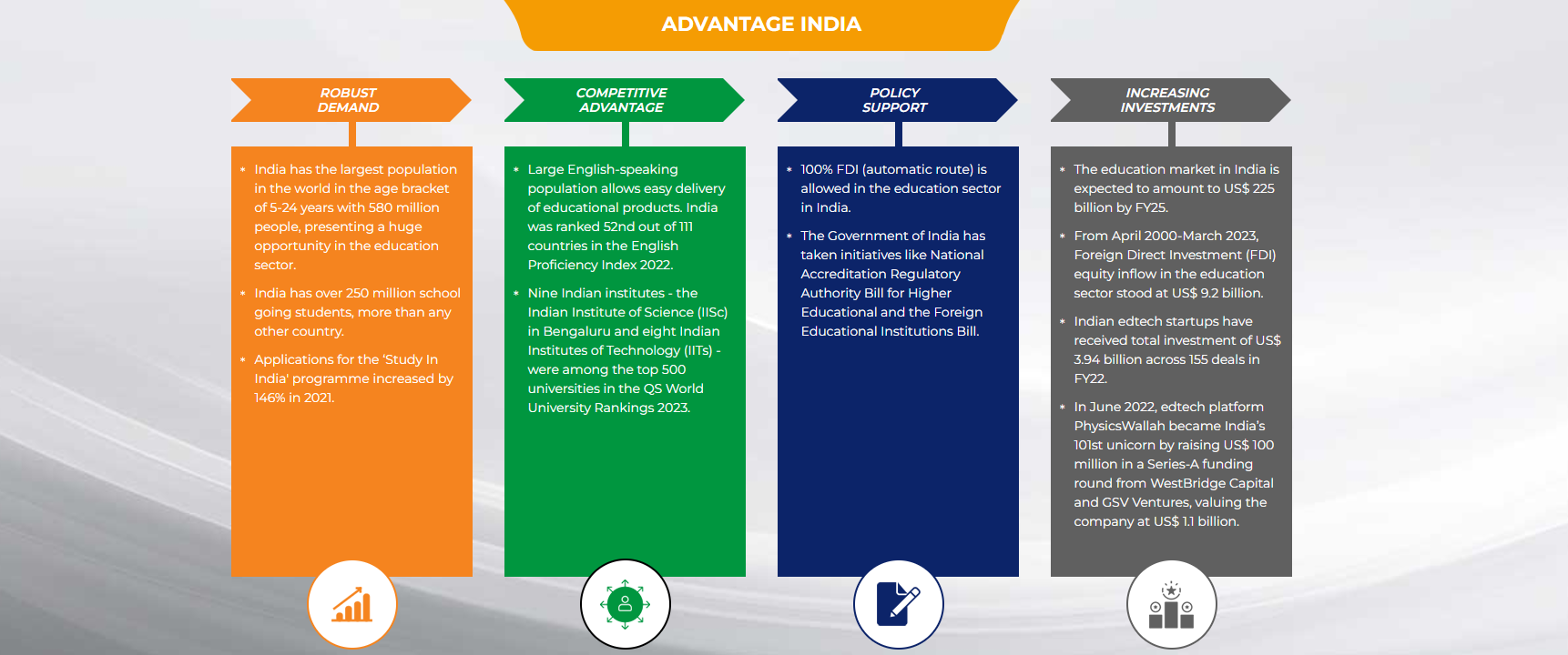 India has the largest population in the world in the age bracket of 5-24 years with 580 million people, presenting a huge opportunity in the education sector. India holds an important place in the global education industry. India has one of the largest networks of higher education institutions in the world. However, there is still a lot of potential for further development and improvement in the education system.